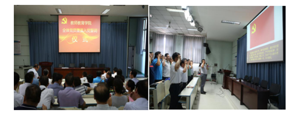 在中国共产党成立96周年之际,教师教育学院党委组织全体党员于 6月19日上午在三号教学楼西第二阶梯教室举行重温入党誓词仪式,仪式在激昂的《国际歌》声中开始。