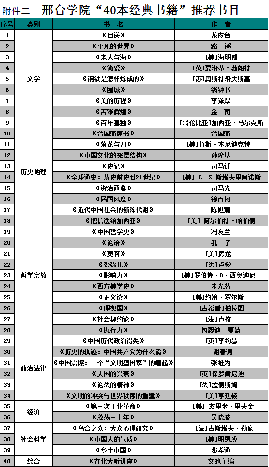 2、书籍可自愿选择也可从邢台学院“40本经典书籍”推荐书目中选择(见下方);