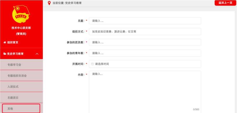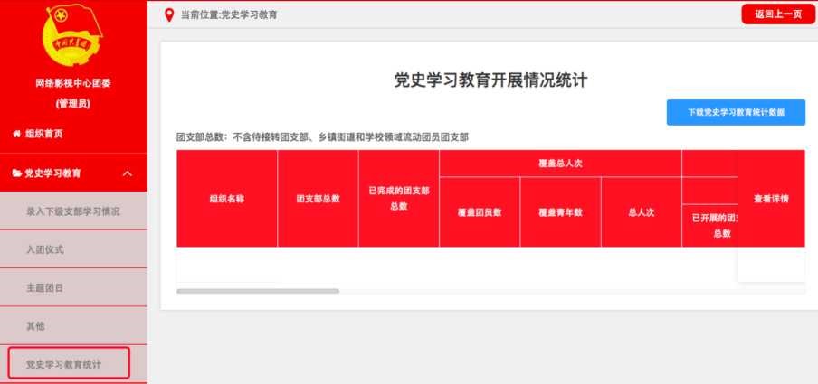 3. 团的领导机关。重点记载党史学习教育主题团日及其他 实践教育活动开展情况,查看所属团组织党史学习教育开展统计情况。具体操作步骤同上。