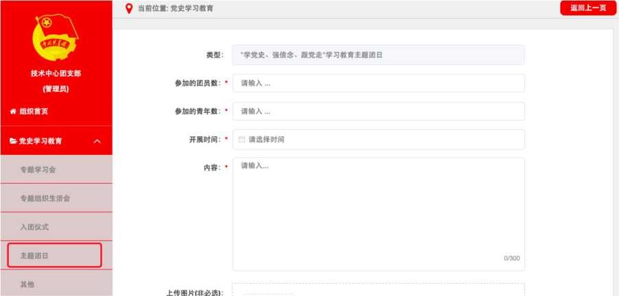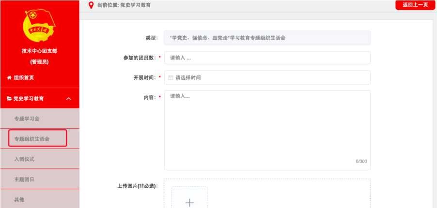 点击默认界面左上角“录入”按钮,进入“录入”界面。根 据专题学习会内容,在“专题”下拉菜单中选择“新民主主义革 命专题”、“社会主义革命和建设专题”、“改革开放专题”、“中国 特色社会主义新时代专题”相应专题,并依次录入专题学习会“参 加的团员数”、“参加的青年数”,选择“开展时间”,在“内容” 栏填写简要情况。可结合实际上传图片资料(非必须,下同), 点击“确定”即完成记载。
