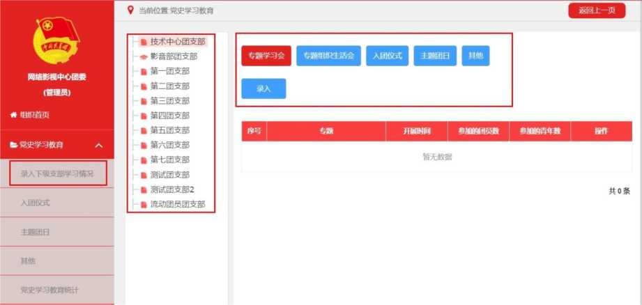 5. 学习情况统计。各级管理员可实时掌握所属团组织党史学习教育专题学习会和专题组织生活会开展情况。其他录入数据由系统后台统计,不在该功能界面展示。