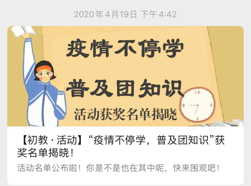 全民抗疫之际,为落实“停课不停学”的号召,初等教育学院团委组织部特于2020年4月13日至4月20日举办“疫情不停学,普及团知识”竞赛,通过线上竞答的形式,增加青年对党团的认识和理解,提高同学们的思想认识水平和政治素质,有助于培养更多优秀的共青团员,使之成长为中国特色社会主义事业的合格建设者和可靠接班人。