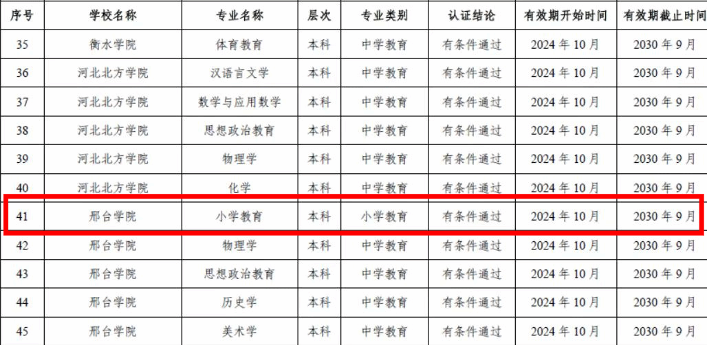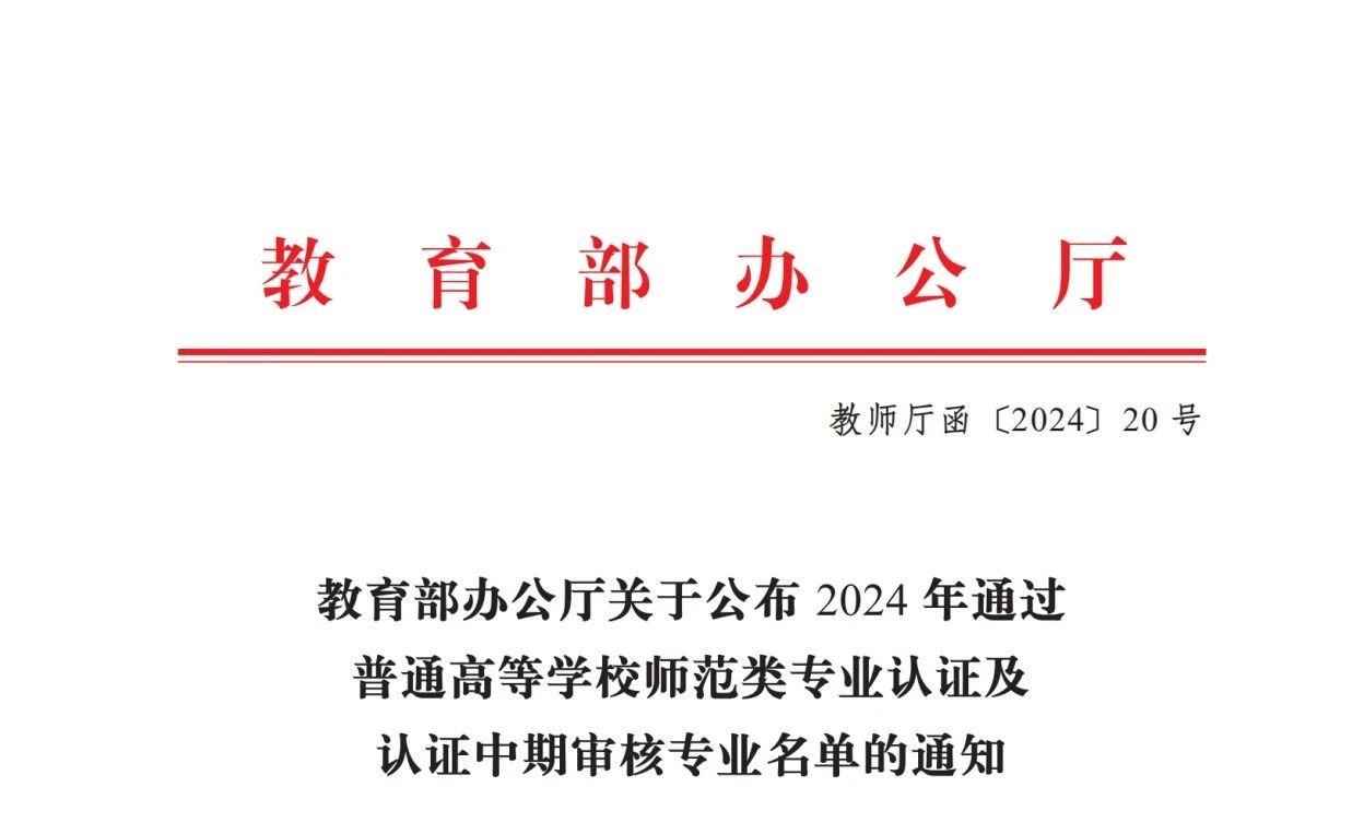 近日,教育部办公厅下发《关于公布2024年通过普通高等学校师范类专业认证及认证中期审核专业名单的通知》(教师厅函〔2024〕20号)。经高校申请、教育评估机构组织专家考查、普通高等学校师范类专业认证专家委员会审定,我院小学教育专业顺利通过第二级专业认证,认证结论有效期为2024年10月至2030年9月。